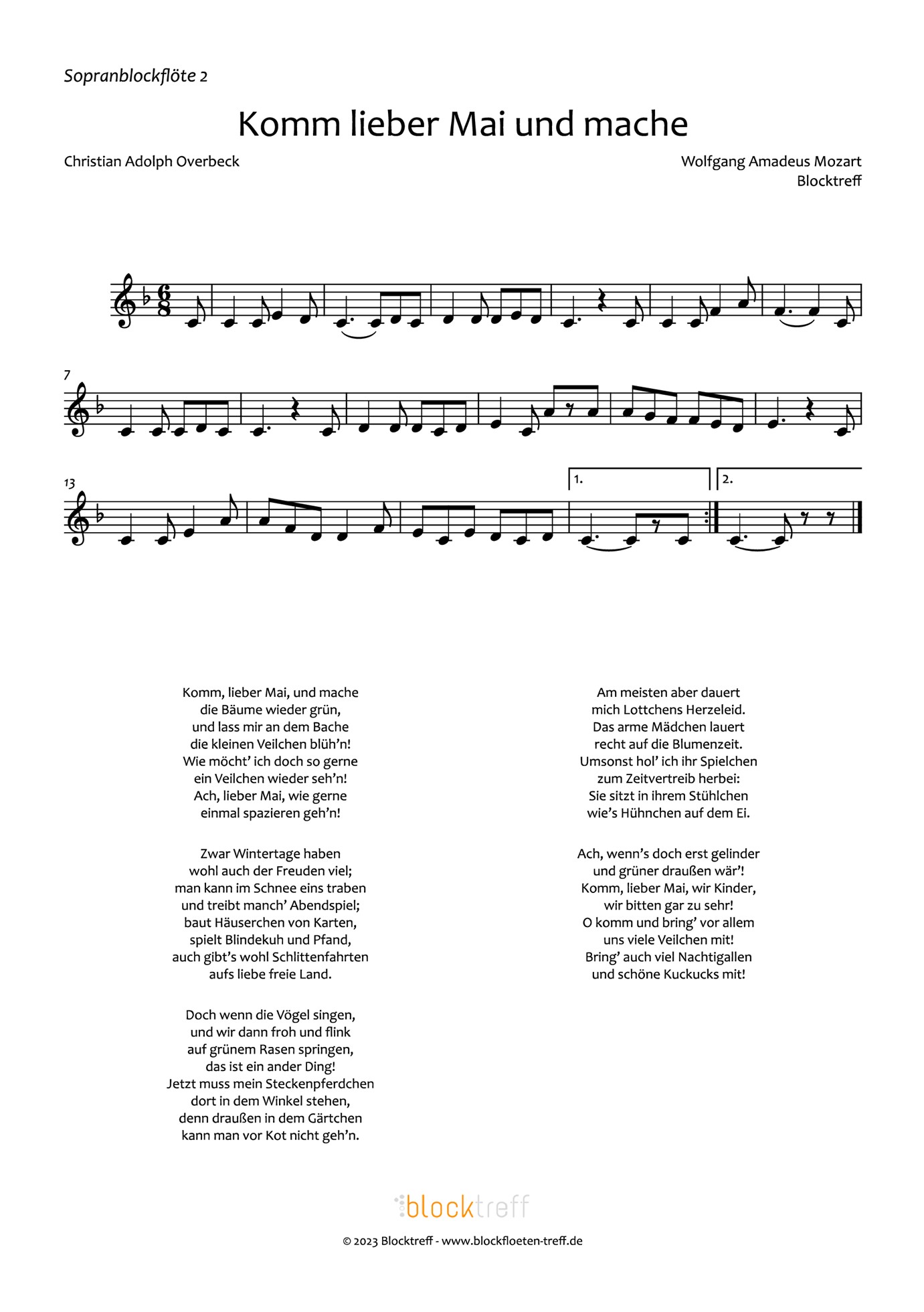 Komm lieber Mai und mache, ein Mailied mit Text von Christian Adolph Overbeck und einer Melodie von Wolfgang Amadeus Mozart. Das Winterlied, das gerne zum Frühlingslied gemacht wird, handelt von der Sehnsucht nach dem Frühling. So ist auch der eigentliche Titel von Mozarts Melodie, welche im Jahr 1791 entstanden ist, der Text dazu hat in 2 Strophen auch nur noch wenig mit dem Originaltext gemein. Er stamm von Joachim Heinrich Campe und wurde 1779 herausgegeben.